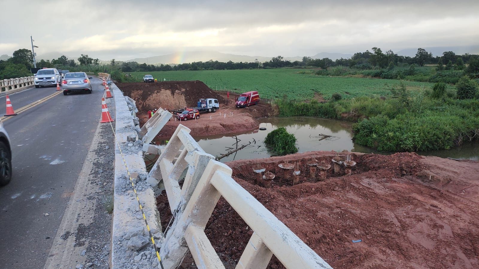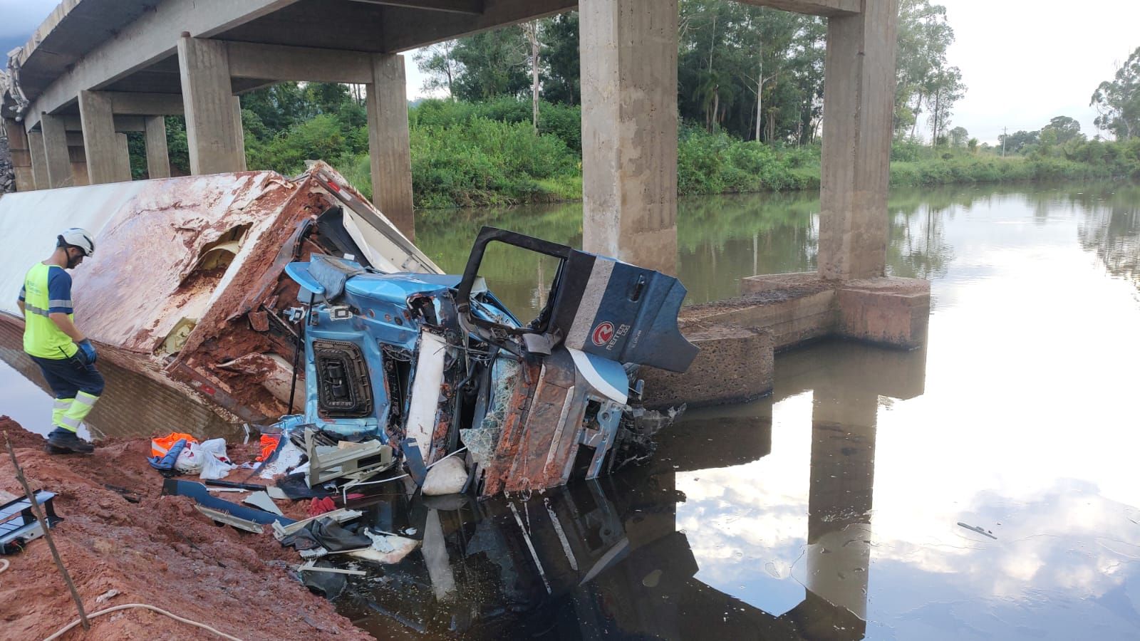 No local, um caminhão trator com semi-reboque acoplado colidiu contra a defensa da ponte, vindo a cair no leito do arroio.