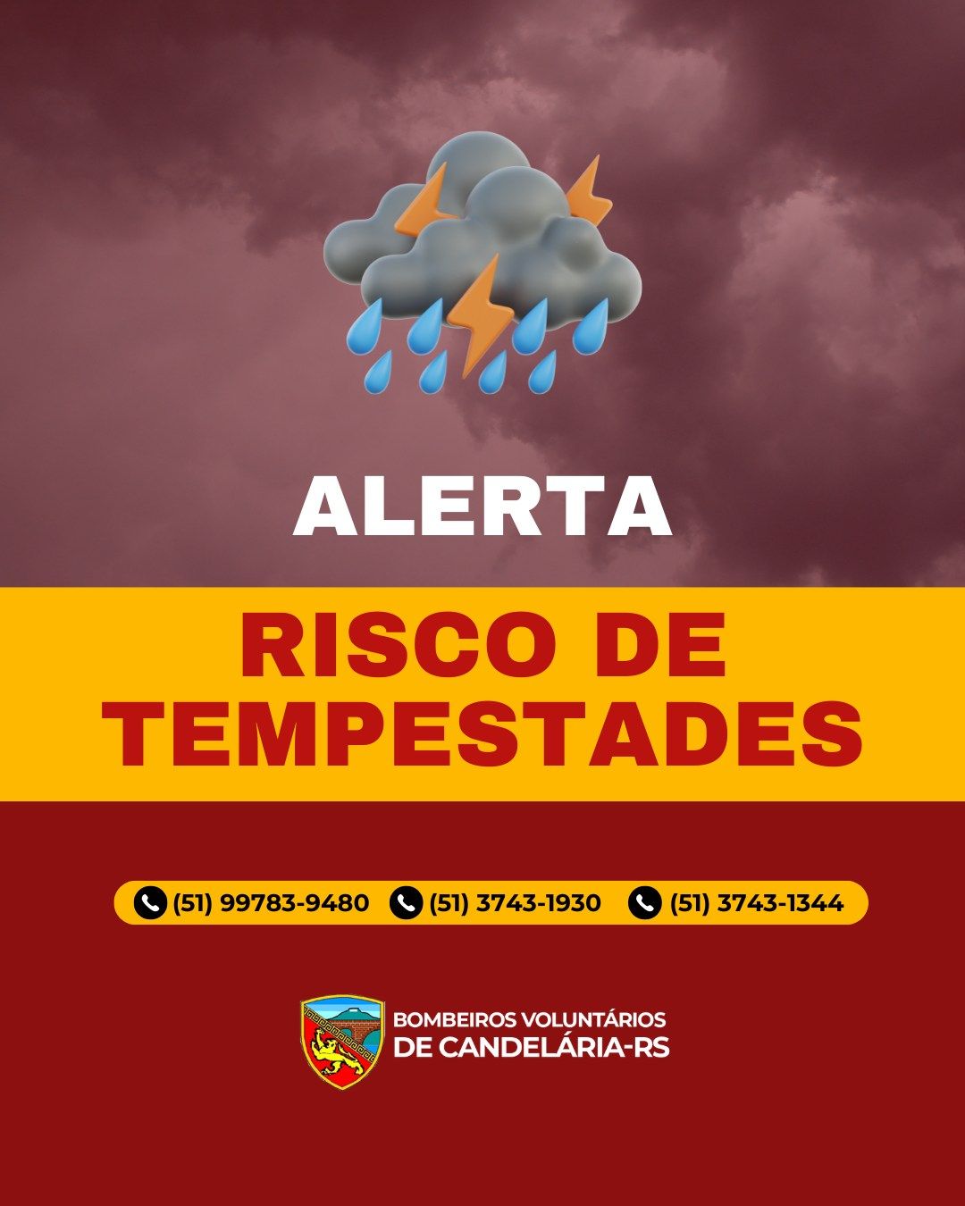Os Bombeiros Voluntários de Candelária alertam a população para RISCO ALTO DE TEMPORAIS no município de Candelária/RS, conforme alertas meteorológicos.