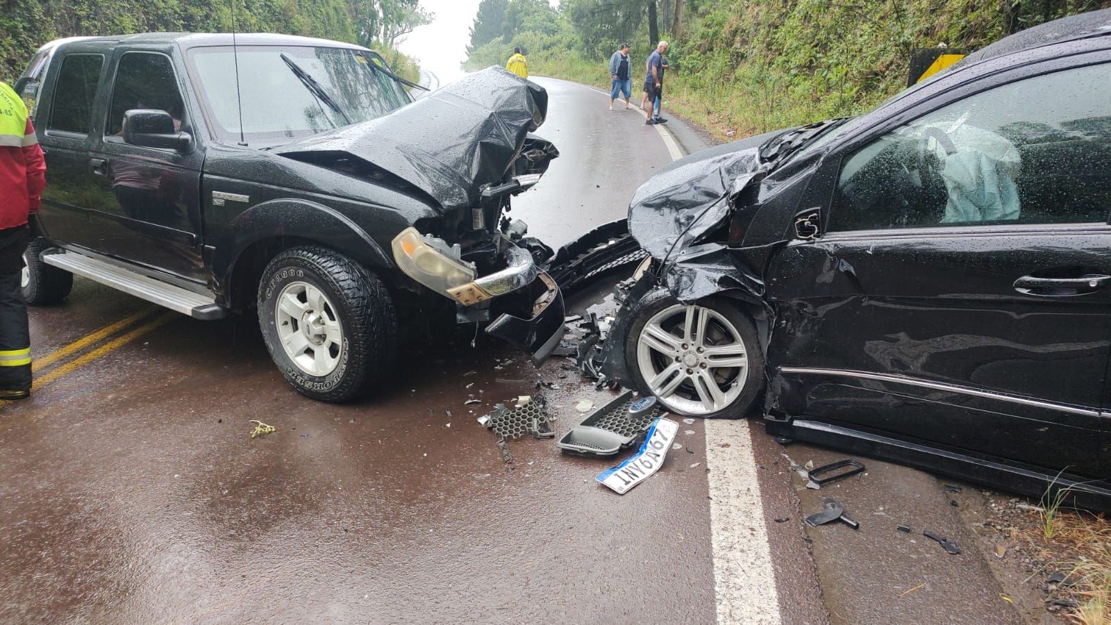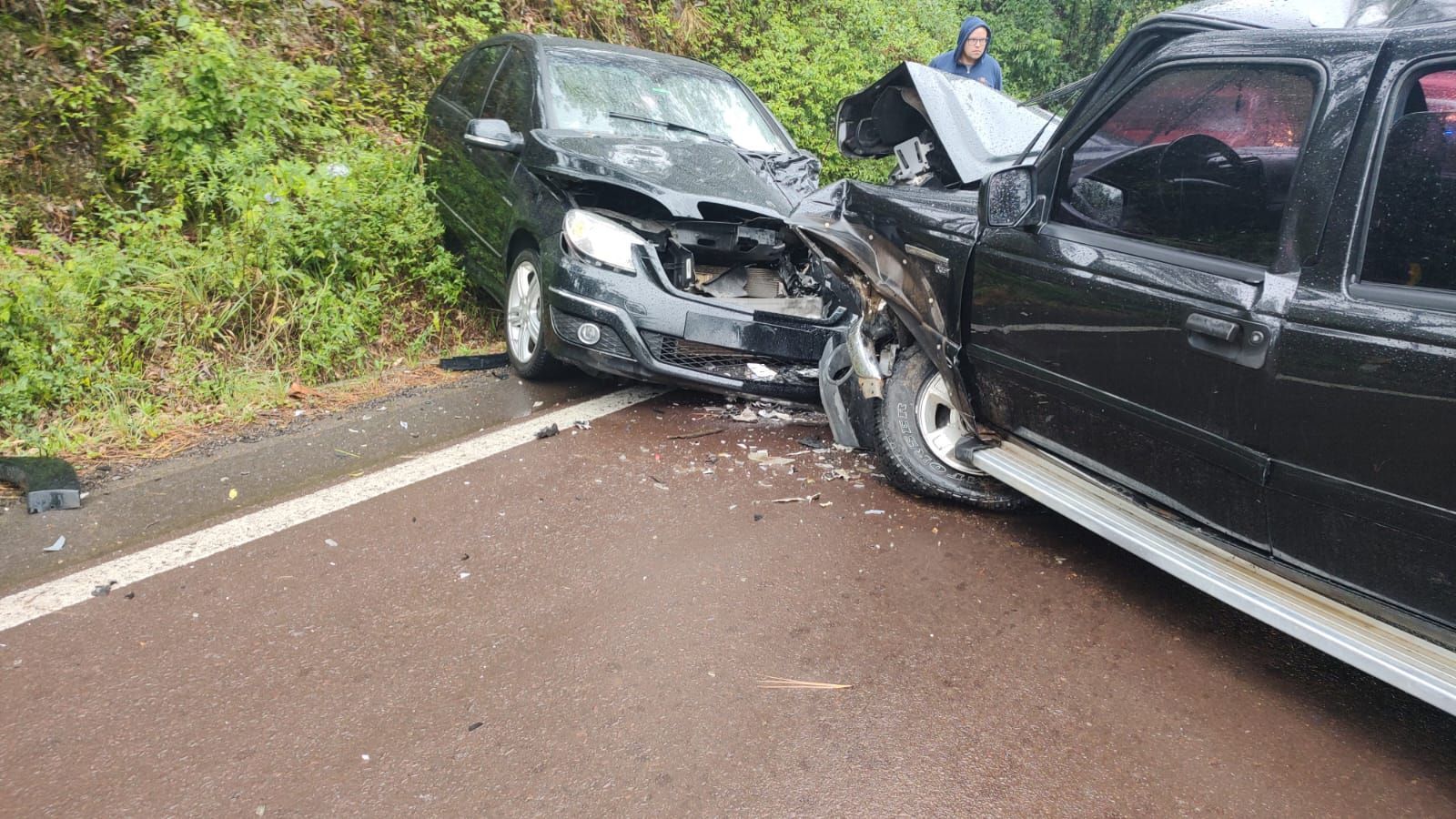 A ocorrência envolveu uma colisão frontal entre um Mercedes-Benz B 200 T, com placas de Passa Sete, e uma Ford Ranger, com placas de Candelária.
