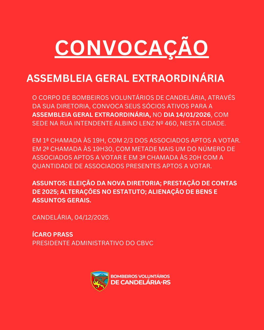 O Corpo de Bombeiros Voluntários de Candelária, por meio de sua diretoria, convoca todos os sócios ativos para a ASSEMBLEIA GERAL EXTRAORDINÁRIA, a realizar-se no dia 14 de janeiro de 2026, na sede localizada na Rua Intendente Albino Lenz, nº 460, em Candelária.
