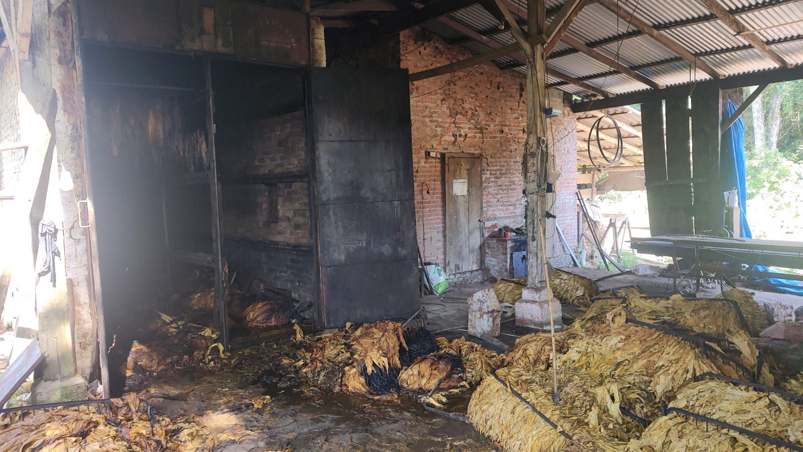 No local, a estrutura estava carregada com **240 grampos** (aproximadamente **90 arrobas**), que acabaram incendiando. Houve **perda total do tabaco** e **danos na estrutura**, porém *felizmente ninguém se feriu*.