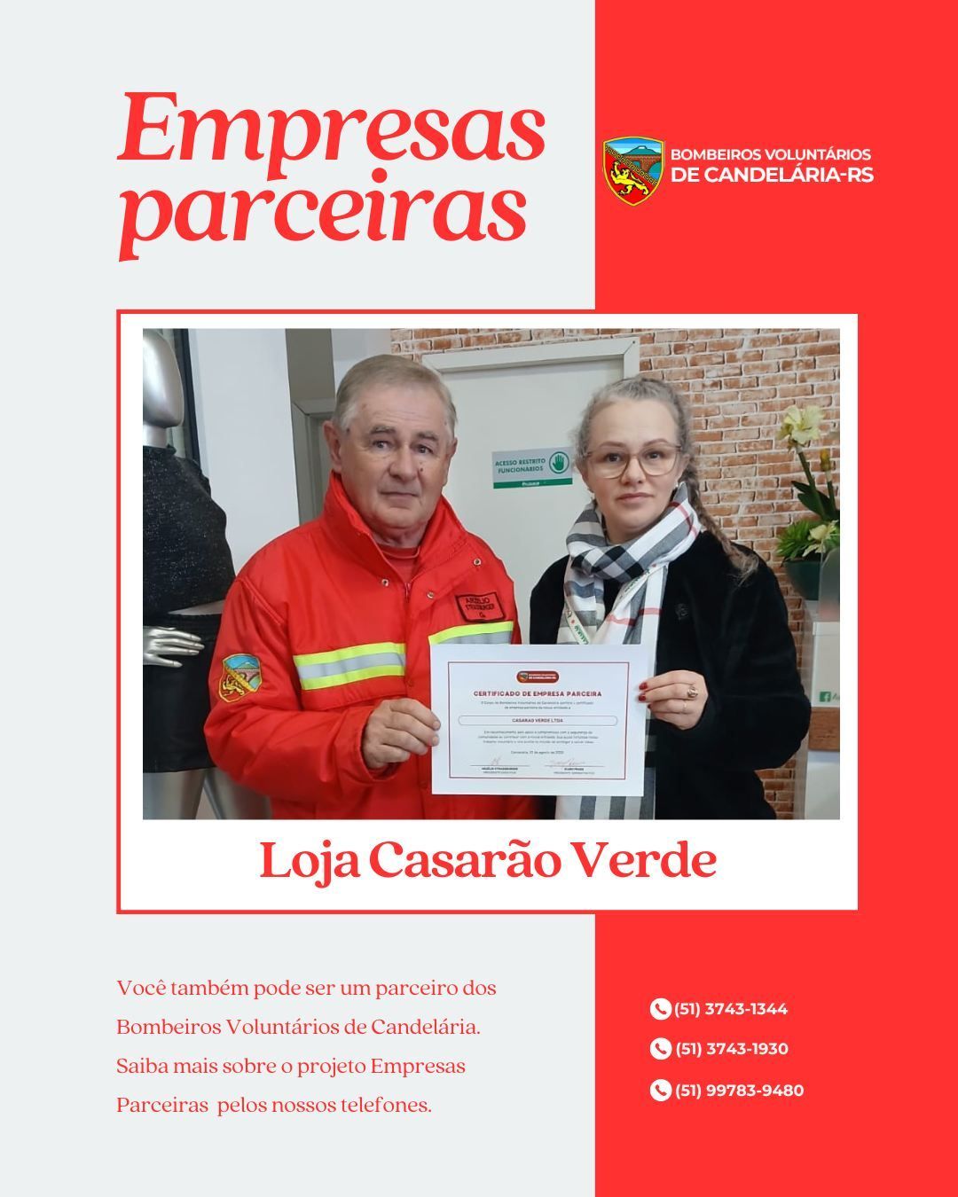 Com alegria anunicamos que o a loja Casarão Verde se junta ao projeto Empresas Parceiras. Esse apoio aos Bombeiros Voluntários é fundamental para a continuidade e o aprimoramento dos nossos serviços, permitindo um atendimento mais rápido e eficiente à comunidade.
