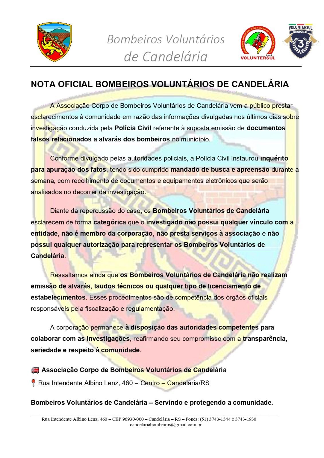 Informamos também que a pessoa investigada não possui qualquer vínculo com a corporação, não é membro da entidade e não representa os Bombeiros Voluntários de Candelária.